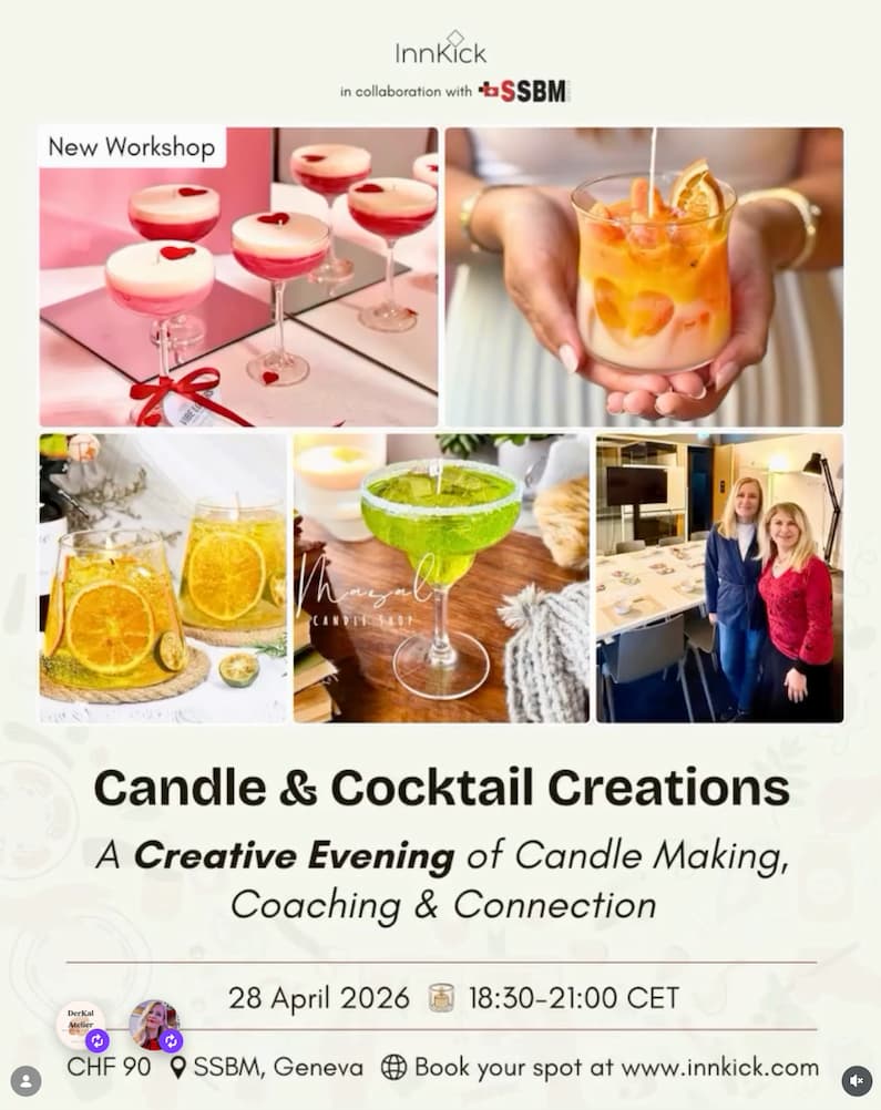 Innkick ve SSBM iş birliğiyle düzenlenen “Candle & Cocktail Creations” etkinliğiyle, Derkal Atelier ile Cenevre’de mum yapımı ve kokteyl tadımıyla dolu yaratıcı bir akşama katılın. 28 Nisan 2026’da saat 18:30-21:00 arasında gerçekleşecek bu özel atölye, koçluk ve bağlantı kurma fırsatlarıyla unutulmaz bir deneyim sunuyor.